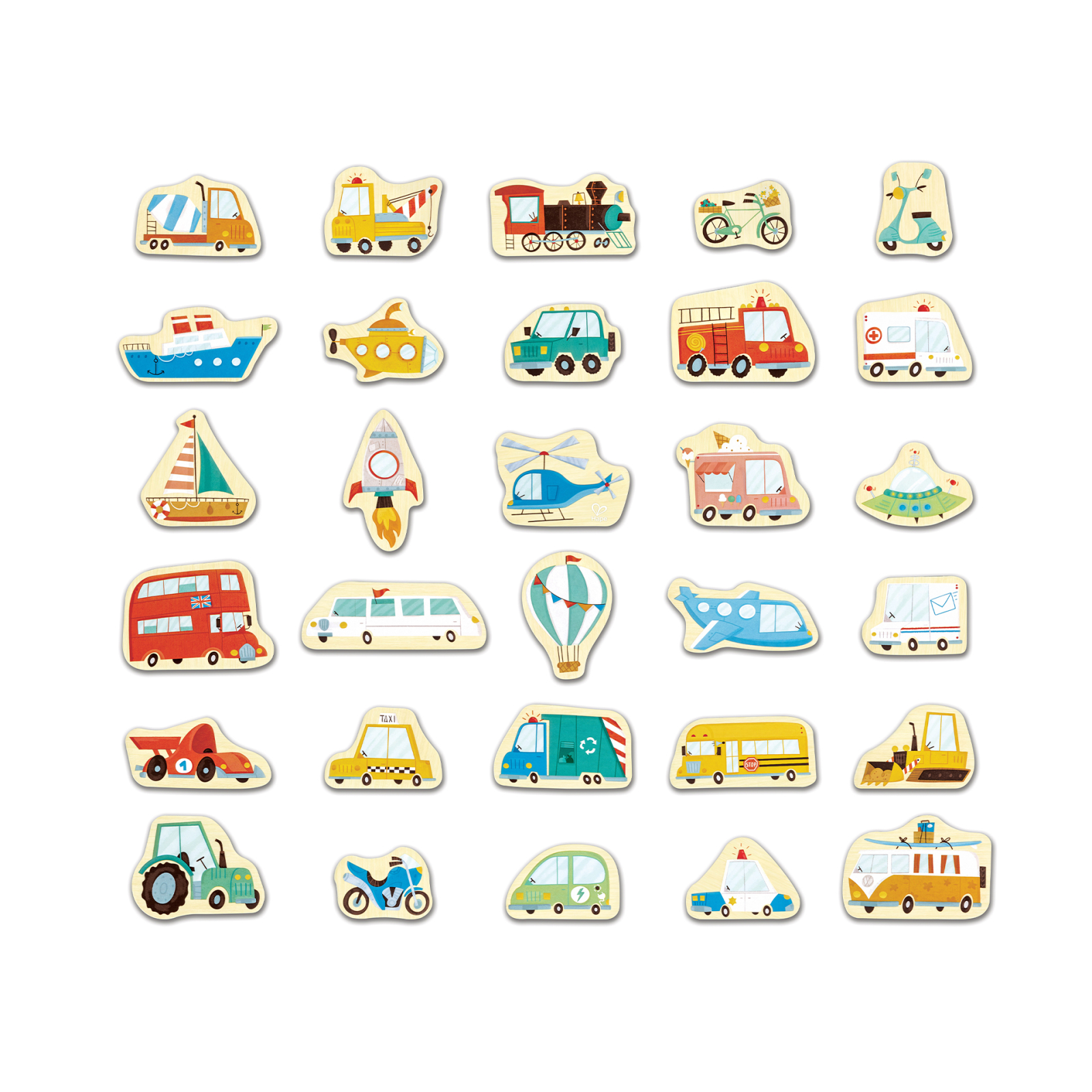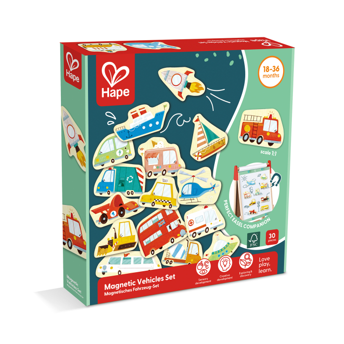 Jucarie din lemn copii – Magneti cu vehicule (30 piese) – Acest set include 30 de vehicule clasice, inclusiv masini, motociclete, avioane, barci si chiar un OZN! Pe masura ce copiii invata despre diferite moduri de transport, ei isi pot crea propriile povesti bazate pe vehicule, ceea ce le imbunatateste abilitatile lingvistice si de comunicare.